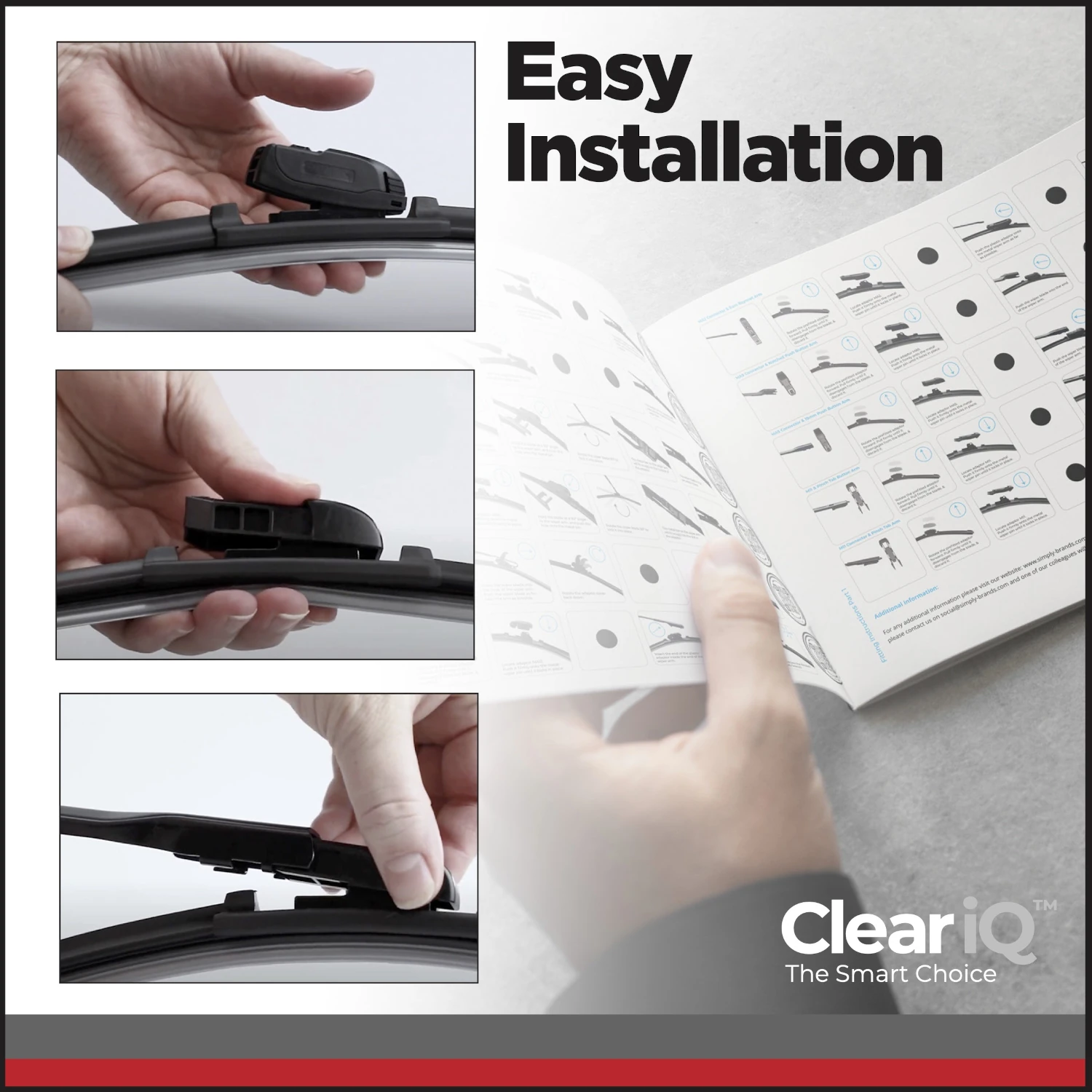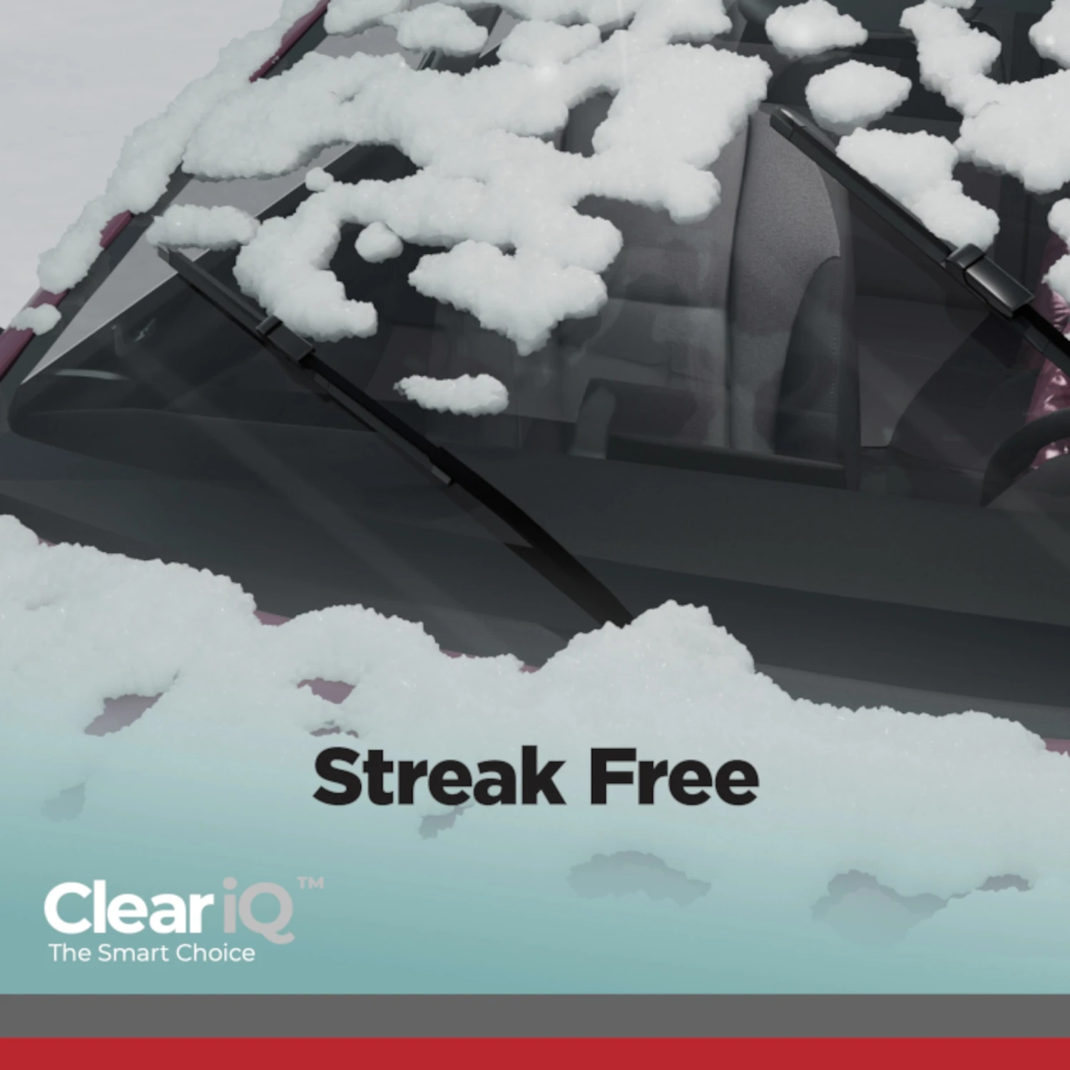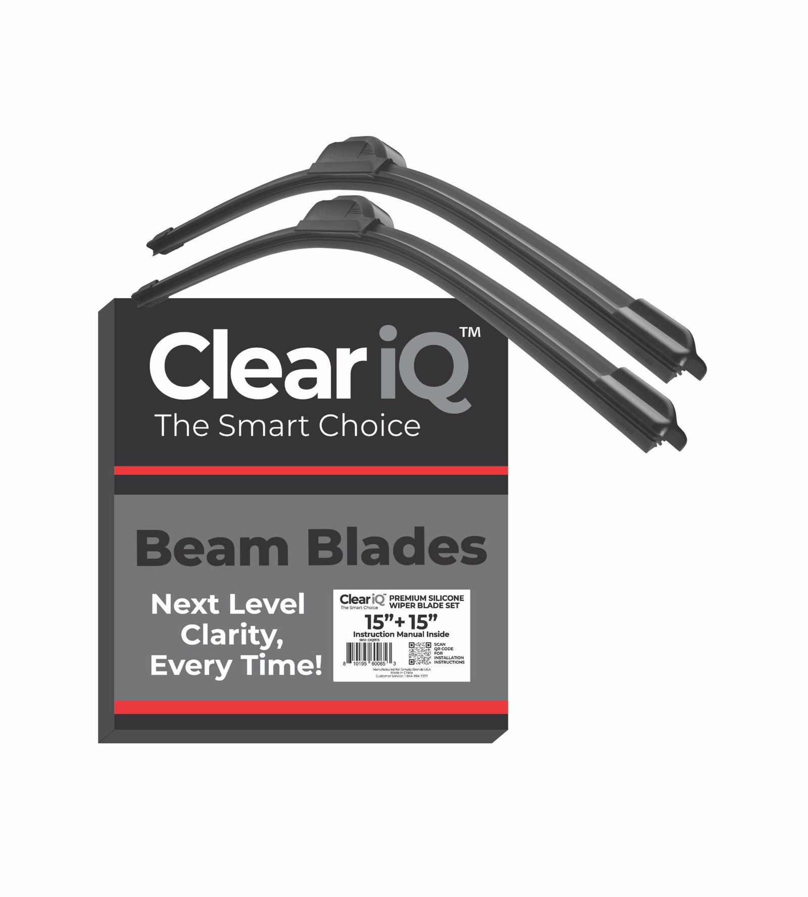 Clear IQ Premium Silicone Front Wiper Beam Blade Set delivers the perfect balance of cutting-edge design and advanced materials for crystal-clear visibility in any condition. Engineered with a frameless beam design and asymmetrical spoiler, these blades maintain consistent windshield contact—even at highway speeds—for streak-free performance every time. The wiping element is crafted from premium silicone rubber, naturally promotes water beading and reduces friction, ensures whisper-quiet operation, and extends durability. With Clear iQ, you get smooth, reliable wiping action that keeps your line of sight sharp—rain, snow, or shine.