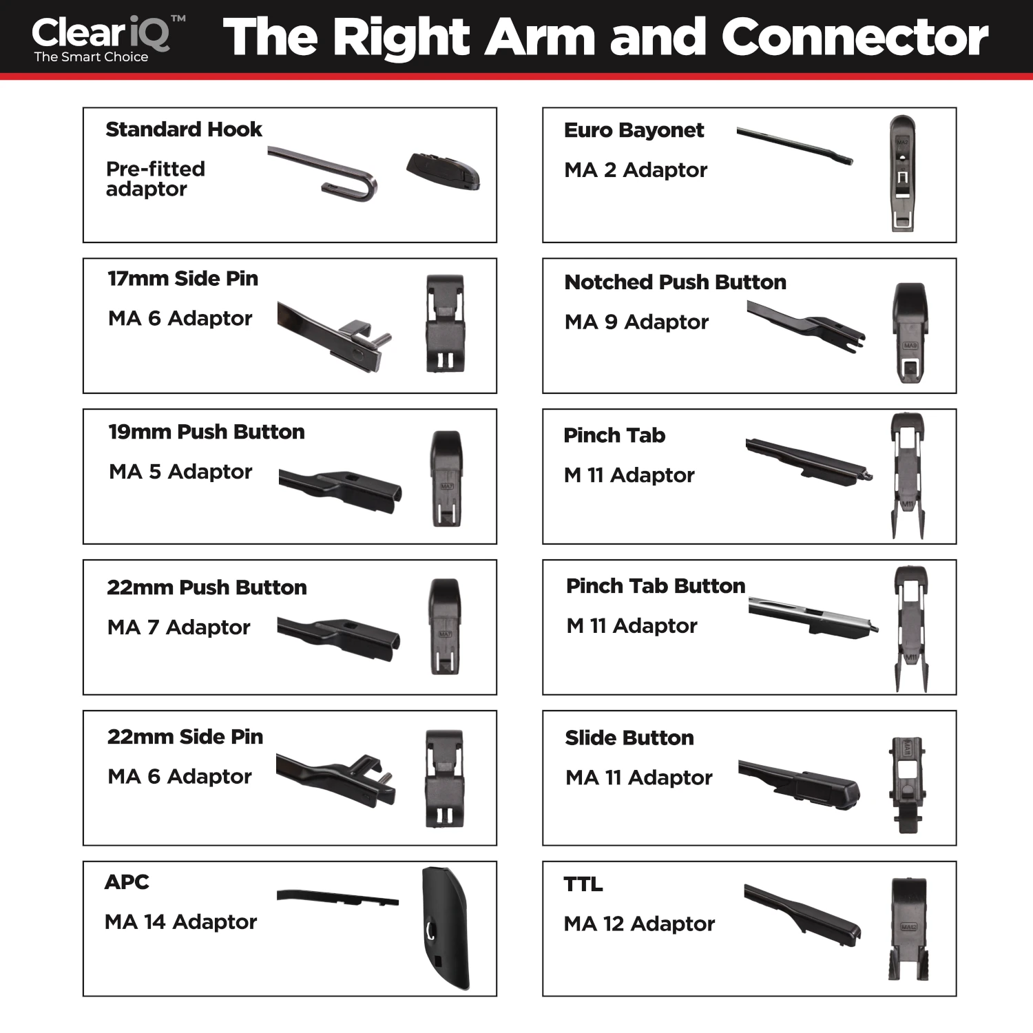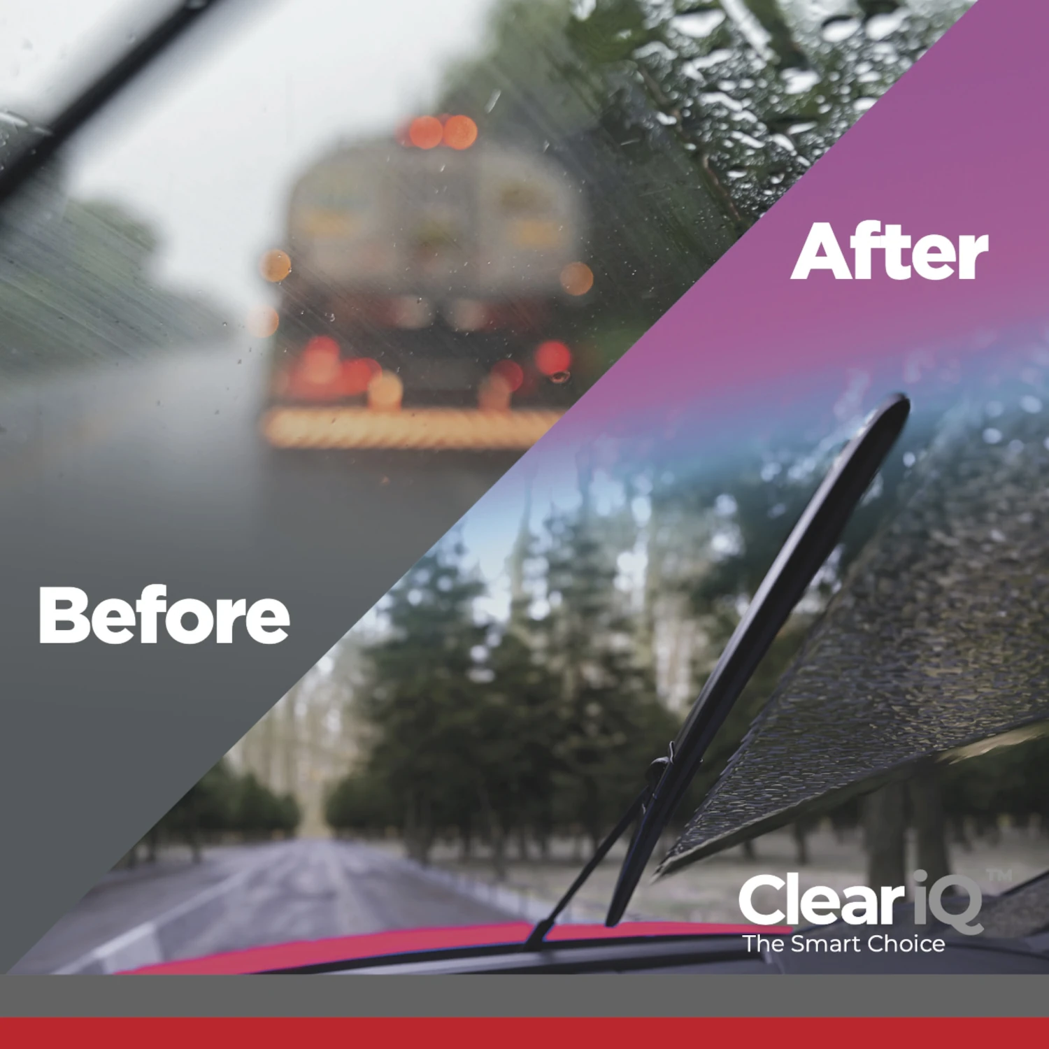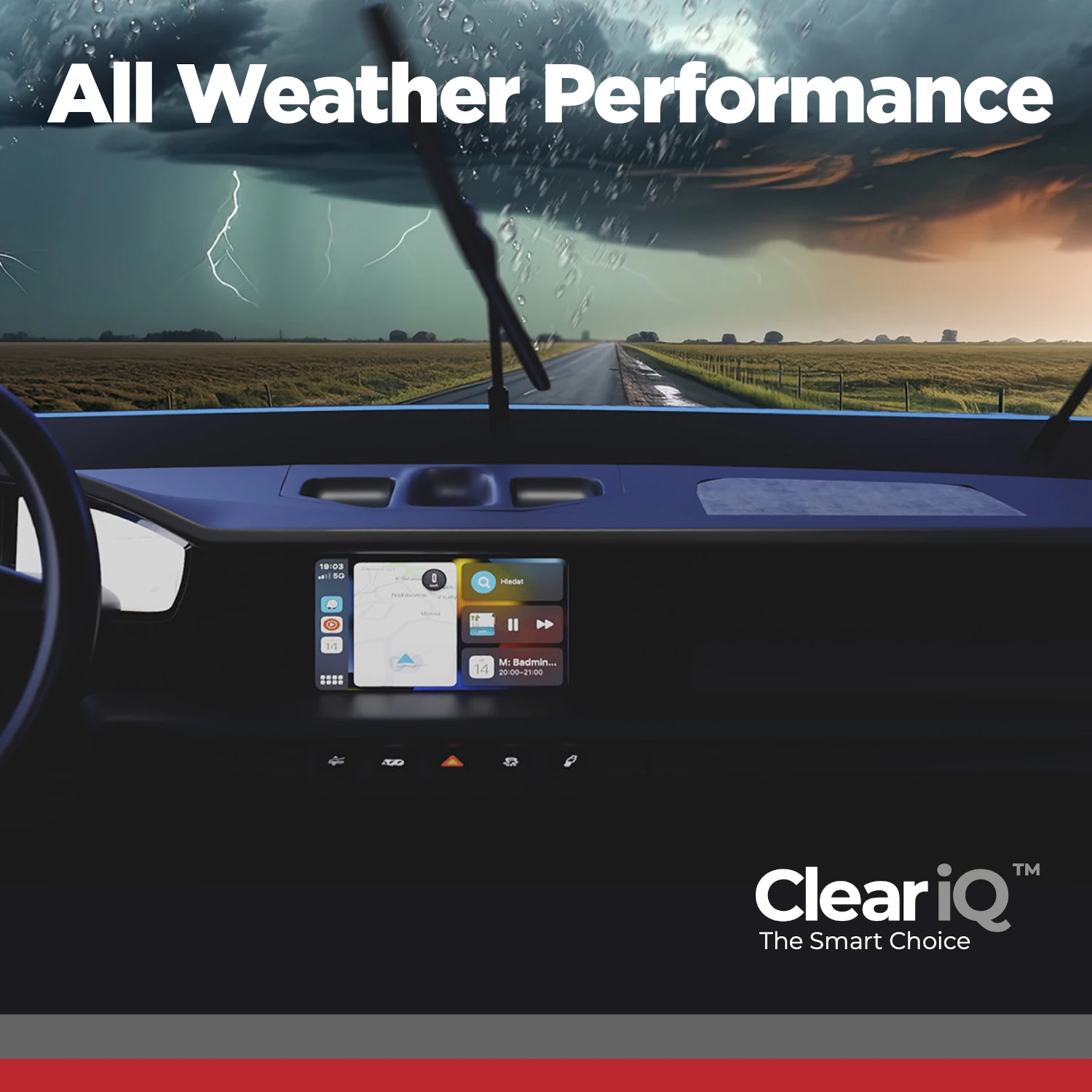 Clear IQ Premium Silicone Front Wiper Beam Blade Set delivers the perfect balance of cutting-edge design and advanced materials for crystal-clear visibility in any condition. Engineered with a frameless beam design and asymmetrical spoiler, these blades maintain consistent windshield contact—even at highway speeds—for streak-free performance every time. The wiping element is crafted from premium silicone rubber, naturally promotes water beading and reduces friction, ensures whisper-quiet operation, and extends durability. With Clear iQ, you get smooth, reliable wiping action that keeps your line of sight sharp—rain, snow, or shine.